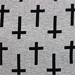 Black two way design crosses on a heather grey cotton jersey rayon blend knit. Fabric has a good stretch, fluid drape, and is light to mid weight. Crosses measure 7.5cm (see image for scale).