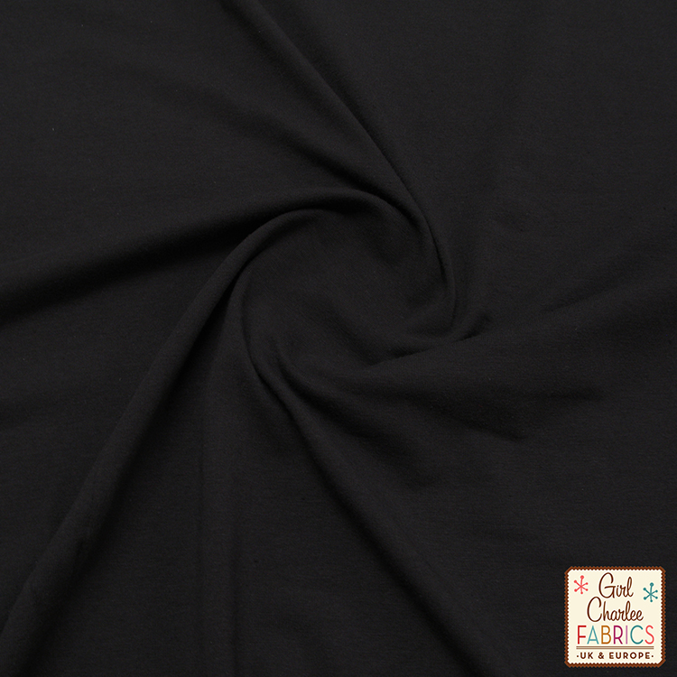 Super top quality medium weight cotton spandex knit in solid black. The perfect fabric staple! True medium weight with a soft hand, good 4 way stretch, and nice recovery.