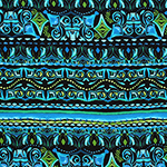 A definite jungle Mayan feel to this ethnic print in lush blues and greens on a mid weight cotton spandex knit. Fabric is soft with a nice drape and 4 way stretch. Pattern repeat is 33cm (see image for scale).