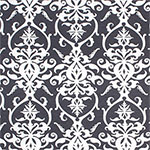 Lovely soft charcoal grey and ivory colour classic baroque design on a cotton jersey poly rayon blend knit. Fabric has a good stretch, fluid drape, and is light to mid weight. Repeat measures 18cm (see image for scale).