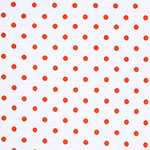 Small 0.6cm coral orange red polka dot on a white cotton jersey poly rayon blend knit. Fabric has a good stretch and is light weight (see image for scale).