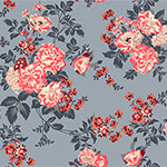 A Girl Charlee Collection Exclusive! Amazing colours of peach, coral pink, cream, mocha, burgundy flowers and roses on a pretty grey background cotton jersey blend knit. Fabric has a very smooth hand, good stretch, and is light to mid weight. Largest rose flower measures 2.75cm. A versatile fabric perfect for many uses. Made in Los Angeles, USA.