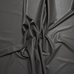 Dark grey, or charcoal, colour poly spandex blend faux vegan leather. Fabric has a textured, small pebble matte surface on the front and a soft spandex knit backing in a black colour. This is a medium weight with a minimal mechanical stretch. Great for apparel, accessories, and more!