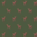 A Girl Charlee Collection exclusive. Our sweet baby deer in a colour way of warm neutral cognac repeating silhouette print on a vintage light forest green colour cotton blend jersey knit. Fabric is soft, mid weight, and has a nice stretch and drape making it suitable for all applications. Fawn measures 4.12 cm tall and 3.49 cm wide. A top quality knit fabric made in Los Angeles, USA.