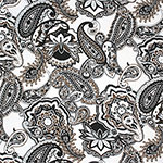 Colours of black, grey, brown paisley floral design on a white cotton jersey knit. Fabric is light to mid weight, with a minimal stretch. Design repeat measures 32cm. Made in USA