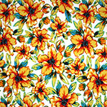 Designer overstock score! Warm goldenrod yellow orange flowers and leaves with teal green and blue accents on white super soft single spandex knit. Fabric has a 4 way stretch, a soft and flowing drape, and is light to mid weight. Flowers measure 10cm (see image for scale).