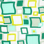 A cool retro mod inspired squares design in different shades of green with yellow and aqua blue on a white cotton jersey poly blend knit. Fabric is light to mid weight with a minimal stretch. Largest squares measure 12cm.