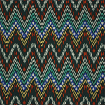 A designer overstock Exclusive! Lovely decorated ornate designed chevron zig zag in colours of royal blue, rust orange, forest green, and mint on a heather grey Hacci sweater knit. Fabric is light to medium weight, a tighter jersey style weave, nice drape, and has spandex for a good 4 way stretch and recovery. Largest chevron zig zag measures 9cm.