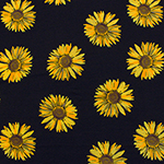 Pretty large scale yellow and orange painted effect sunflowers on a black colour soft cotton jersey rayon blend with spandex for a nice stretch and good recovery. Fabric is light to mid weight. Sunflowers measures 9.5cm.
