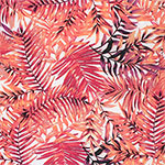 Great print! A slub poly cotton rayon blend knit with an overlapping palm leaves design in hues of pink, purple, and orange on a white background. Fabric is light weight, with a small stretch, and slight slub texture. Design repeat measures 66cm (see image for scale).