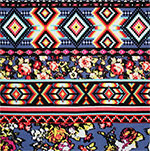 Love this print! Unique combination or natural floral and digital ethnic design in colors of coral, purple and more that pop on a cotton jersey poly rayon blend knit. Fabric has a good stretch, fluid drape, and is light to mid weight. Biggest floral row measures 5cm (see image for scale).