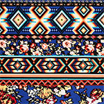 Love this print! Unique combination or natural floral and digital ethnic design in colours of peachy pink, royal blue and more that pop on a cotton jersey poly rayon blend knit. Fabric has a good stretch, fluid drape, and is light to mid weight. Biggest floral row measures 5cm (see image for scale).