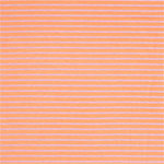 A sweet sherbet orange and lavender purple small stripe cotton jersey rayon blend knit. Fabric is a light to medium weight, with a great stretch, and a soft, drapey hand. Sherbet orange stripe measures 0.5cm and small lavender purple pin stripe measures 0.3cm.