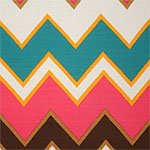 A designer overstock Exclusive! Teal blue, fuchsia, brown, tan, and orange stitched big chevron design on a cream colour Hacci sweater knit. Fabric is light to medium weight, a tighter jersey style weave, nice drape, and has spandex for a good 4 way stretch and recovery. Largest chevron zig zag measures 16cm.