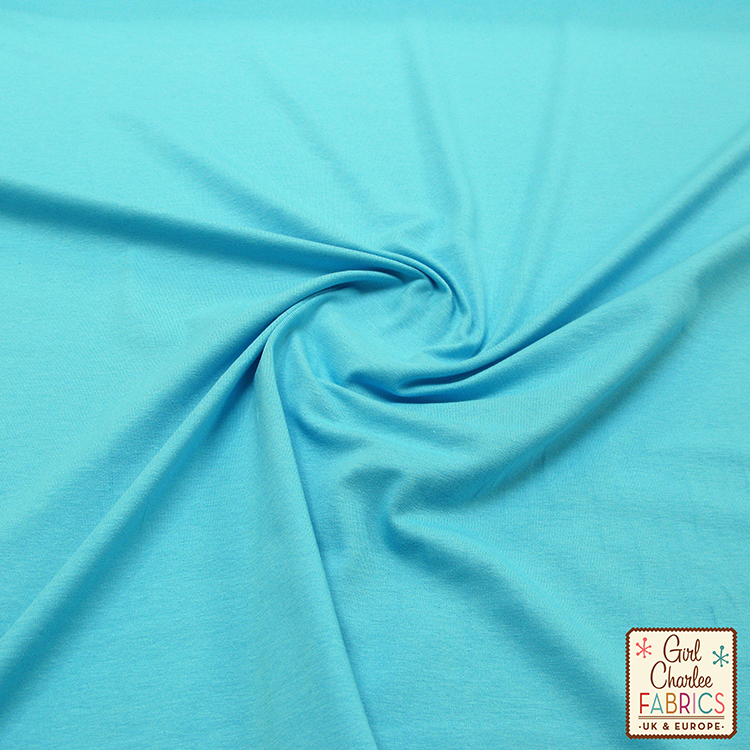 Super top quality medium weight cotton spandex knit in a lovely turquoise blue colour. The perfect fabric staple. True medium weight with a soft hand, good 4 way stretch, and nice recovery.